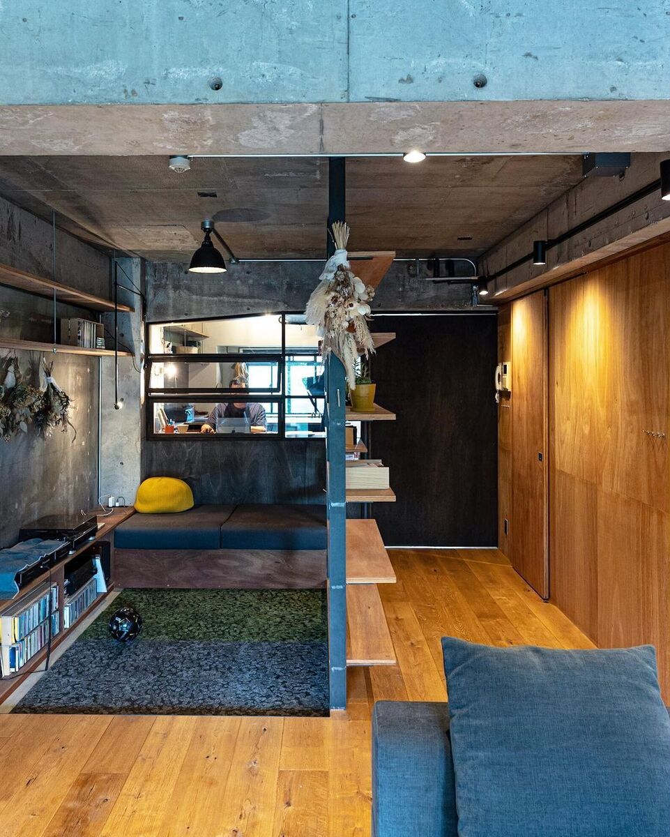 剥き出しのコンクリートのクールで男前な空間に、木材のナチュラルな素材を加えることで、スタイリッシュながら暖かみのあるリビングに!隣のワークスペースとは室内窓で、音楽や読書を楽しむソファーコーナーは造作棚でと、壁を作らず仕切ることで、抜け感を演出しています