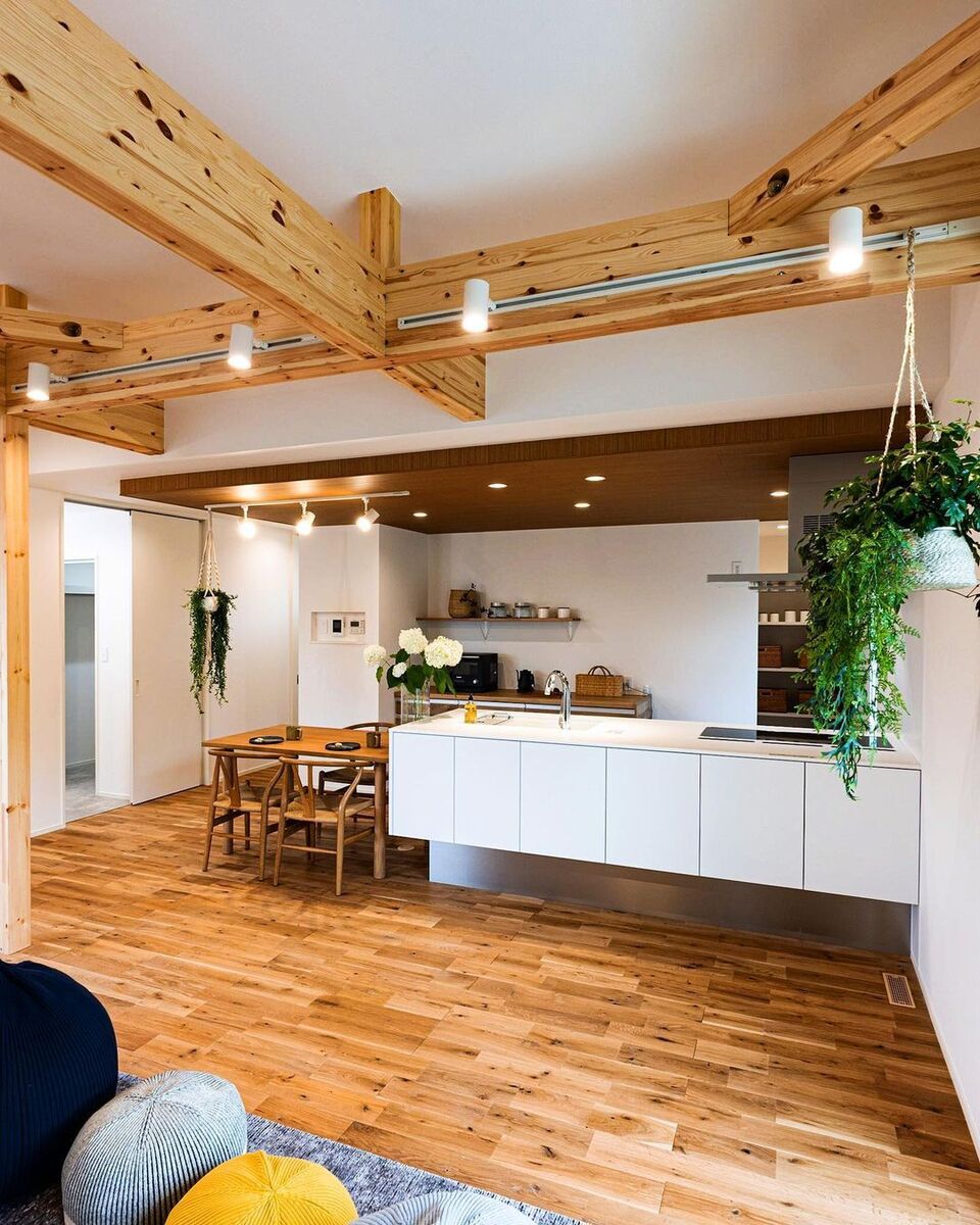無垢材の勾配天井と床から木の温かみが伝わるナチュラルなダイニングキッチン。隣に設けた小上がり和室は、腰掛けたり、お昼寝したり、お客様にお泊りしてもらったりと、とっても役に立つスペースです◎
