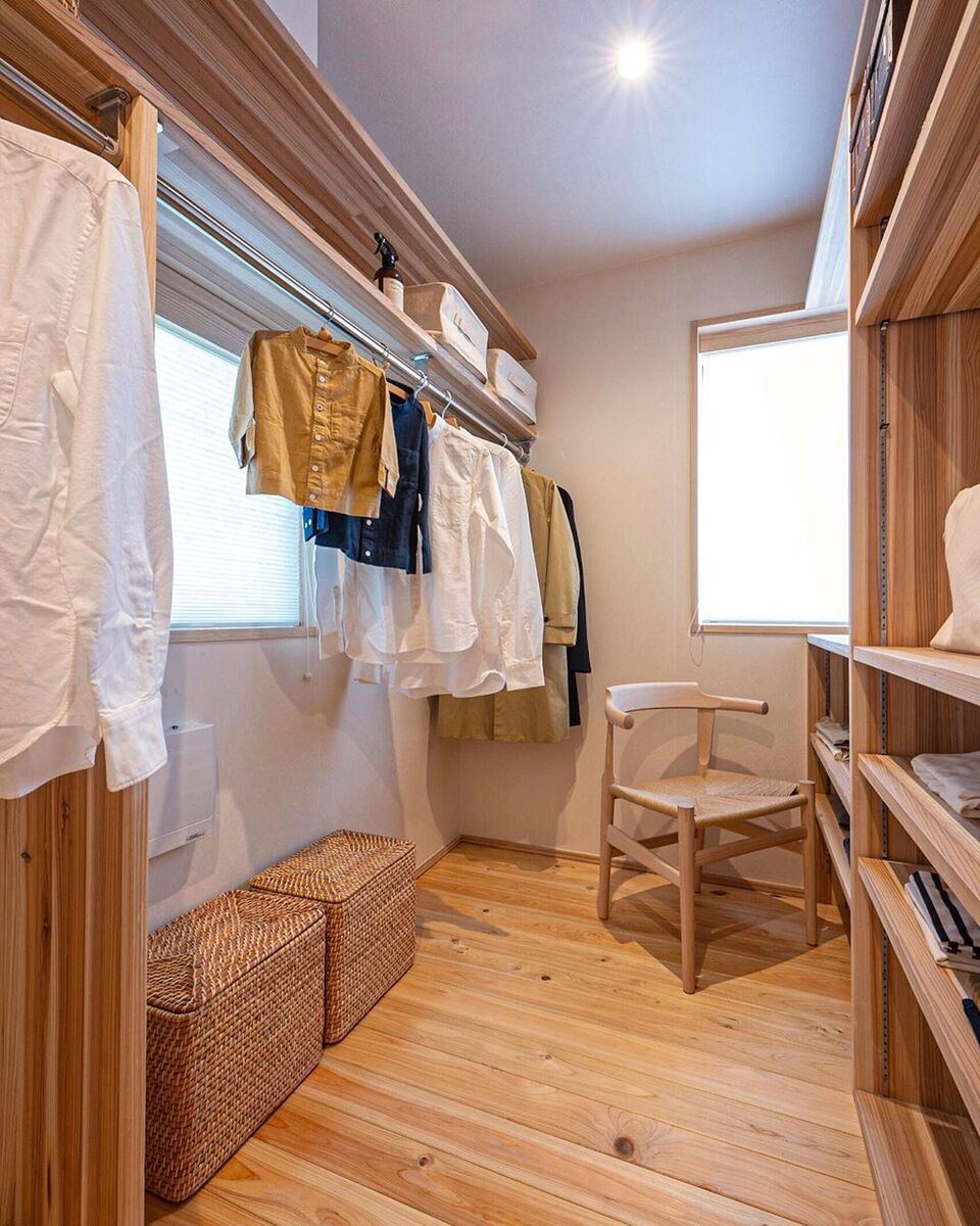 玄関横には大容量のシューズクロークで玄関はすっきり!可動棚で長靴や靴以外の収納にも対応でき、ハンガーパイプを通して上着をかければ、外からの埃や花粉、ウイルスもシャットダウン!