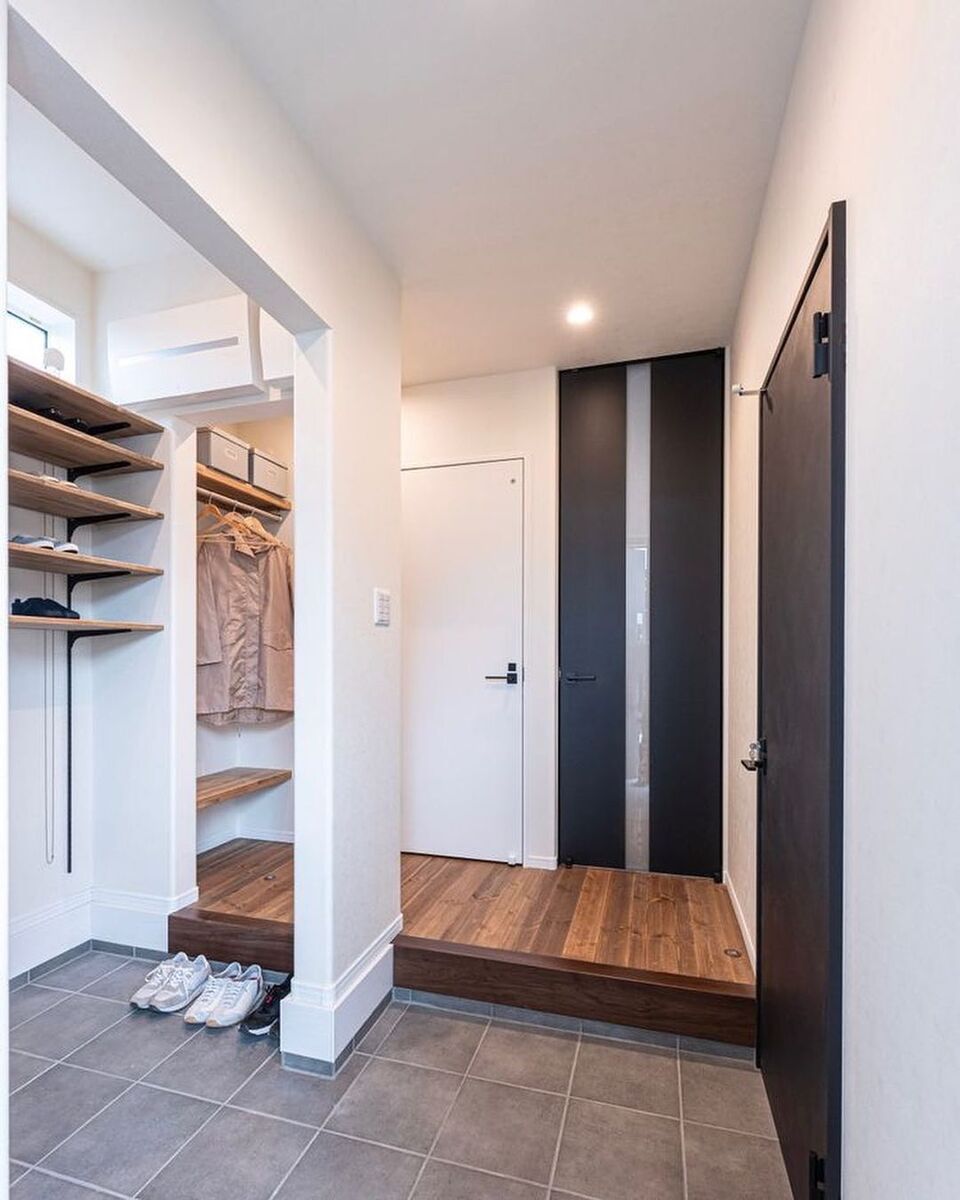 ファミリー玄関には大容量の可動棚で家族全員の靴を収納!気になる臭い対策には高窓で空気の流れ+明るさも確保。奥にあるパイプハンガーのコートクロークに上着をかければ、花粉やウイルスをお部屋に持ち込まず安心です。