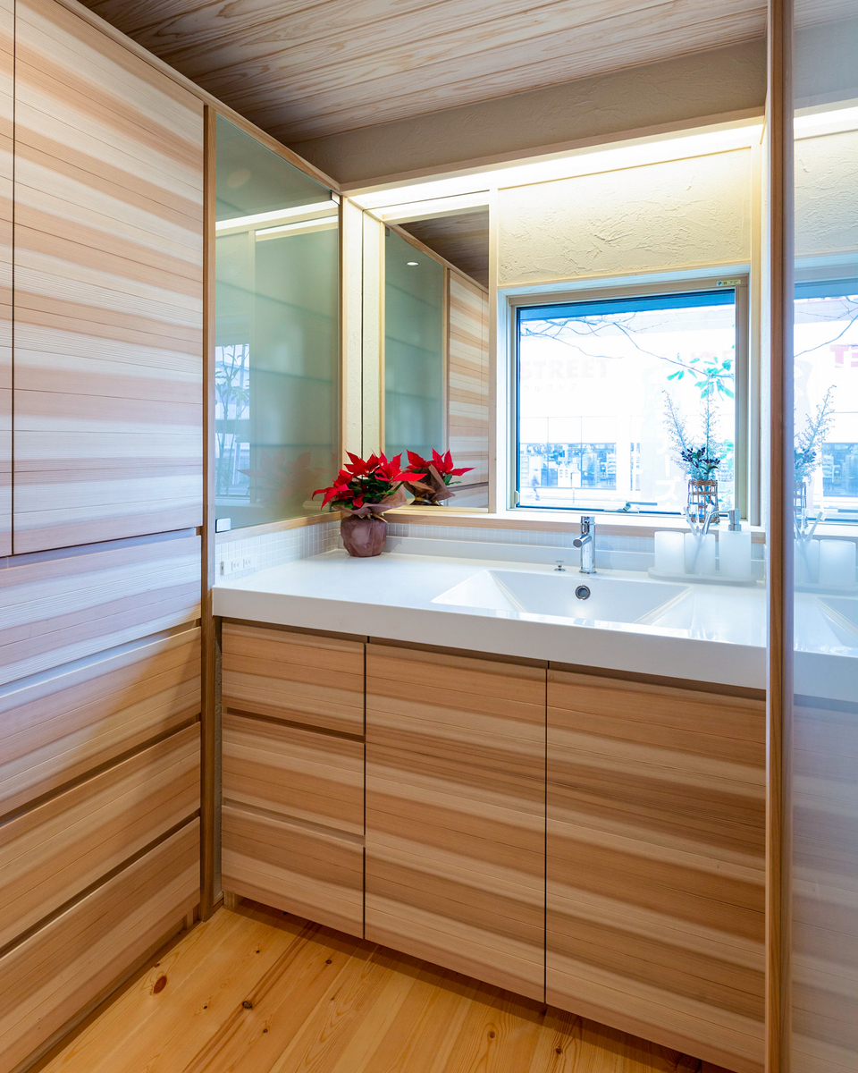 木目の美しい造作洗面台は収納量たっぷり!窓の光も明るく清潔感あふれる空間